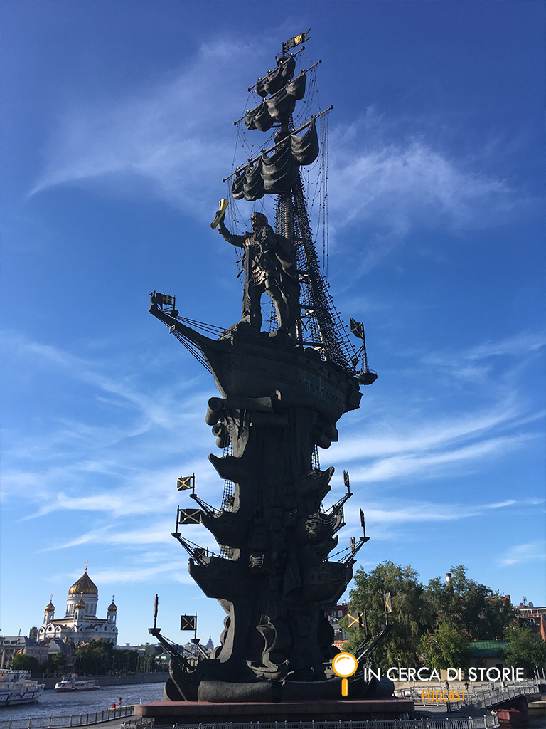 La storia di quest’oggi nasce qualche giorno fa. Stavo rivedendo un po’ di foto del mio viaggio in Russia del 2018 e tra le foto scattate a Mosca mi sono soffermato su una di esse, dove ho immortalato una statua. Ve la descrivo: in alto spicca un uomo in piedi sulla prua di una fregata. Con la mano sinistra regge il timone, con la destra un rotolo d’oro. Alla base della statua altri velieri di forme e dimensioni diverse tra loro. La foto la trovate ovviamente sul sito di In Cerca di storie e sulla pagina Instagram del podcast.