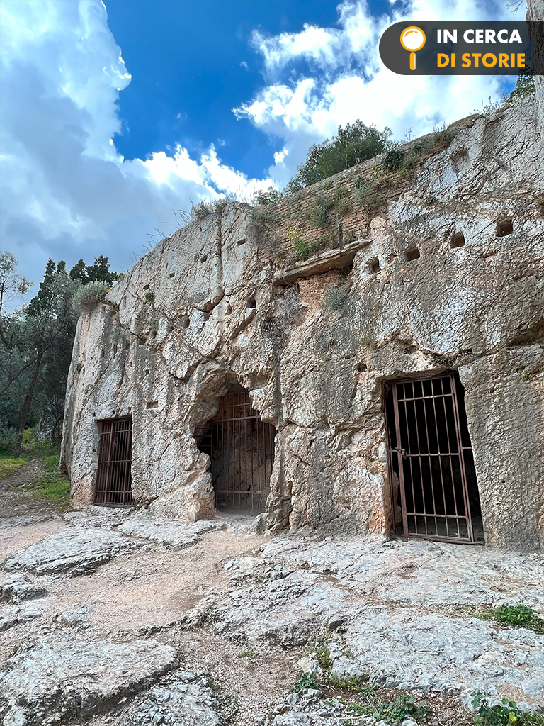 Accusato di ateismo e di corrompere i giovani, il filosofo scelse la condanna a morte (bevendo una coppa di cicuta) all’esilio. Non ci sono prove certe che fu detenuto proprio in questa grotta. La struttura doveva probabilmente svilupparsi su tre piani come testimoniato dalle travi sulla superficie della roccia e da una scala scolpita. La parte posteriore è l’unica che si è conservata. Si tratta di un complesso di tre stanze e una cisterna sul retro.