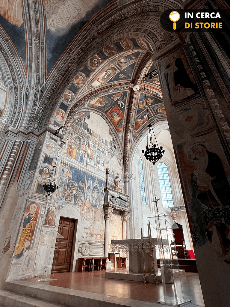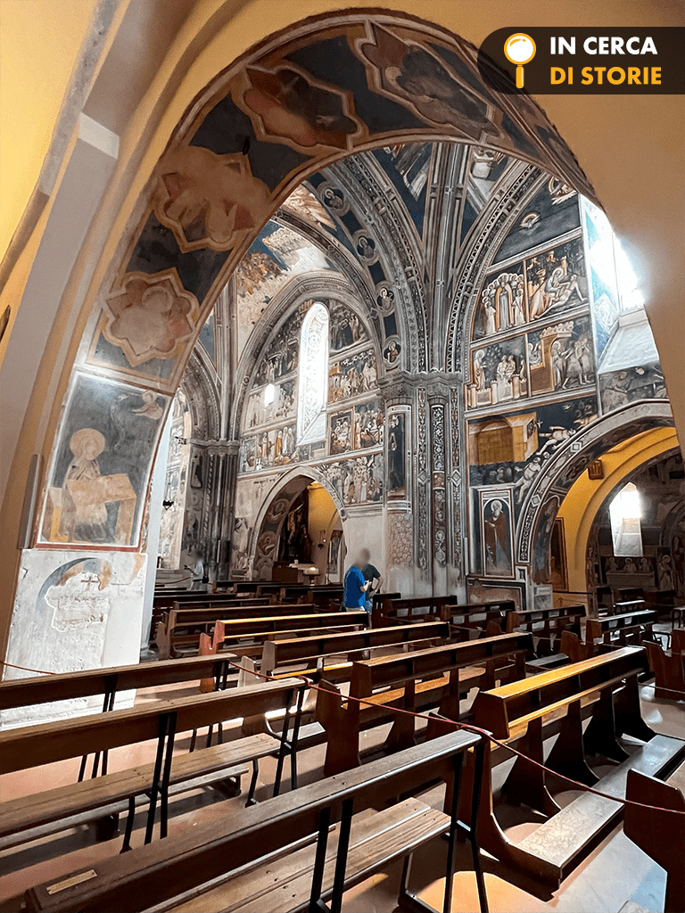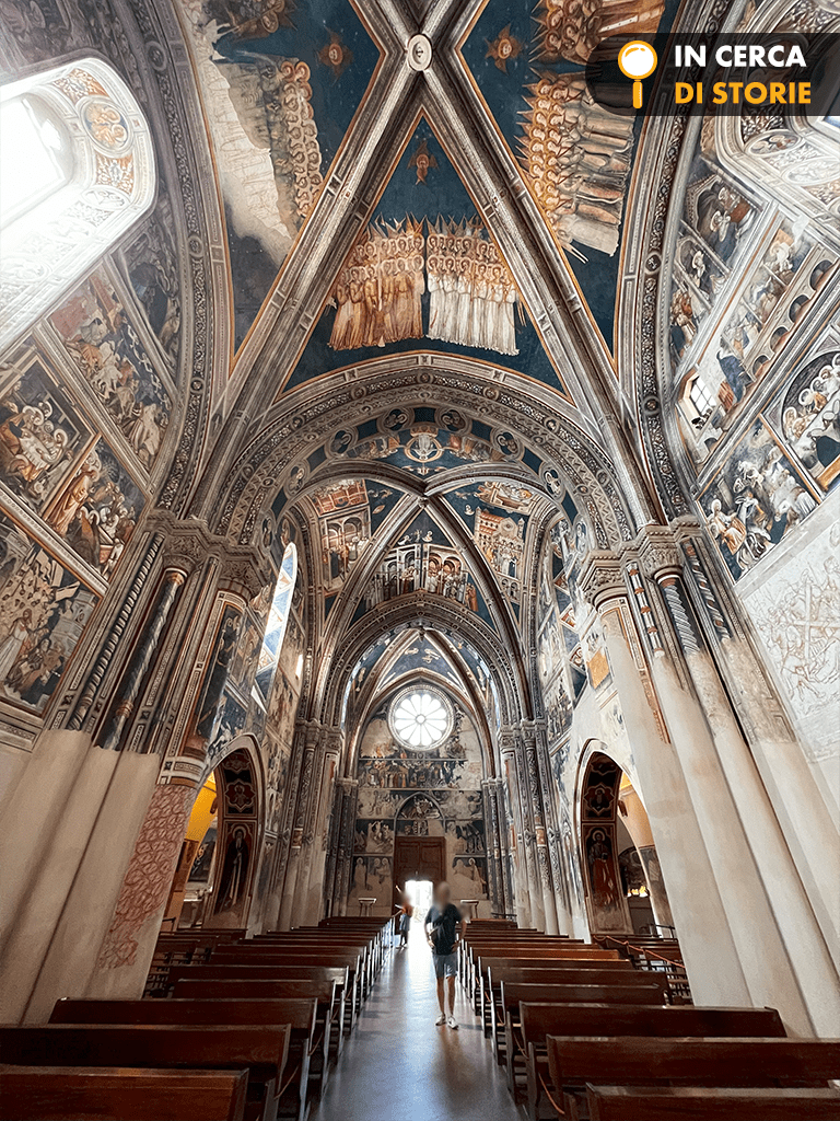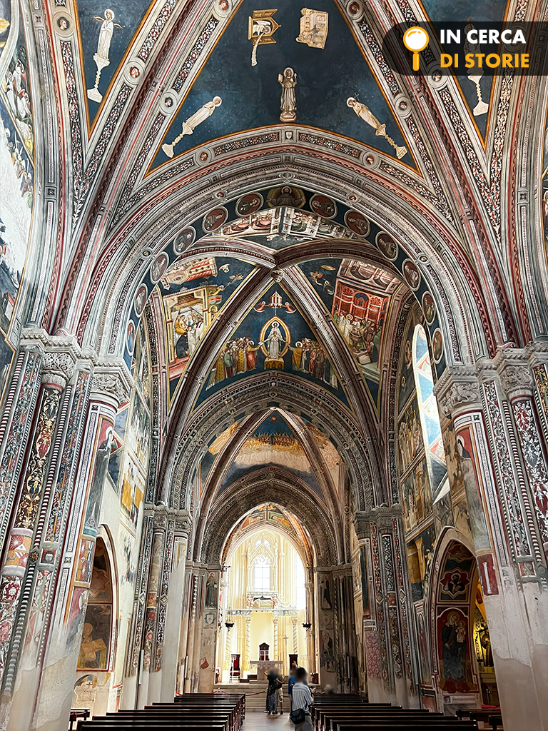 La basilica è una commistione di stili, principalmente Romanico e Gotico. Il punto forte, senza dubbio, sono i suoi interni affrescati in stile giottesco e della scuola senese voluti dalla principessa Maria d’Enghien che non era soddisfatta dei primi affreschi della basilica commissionati da suo marito. Come potete vedere bene in foto, il colpo d’occhio è notevole. I dettagli sono infiniti e l’atmosfera che creano è unica.