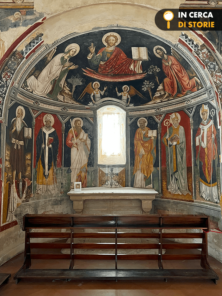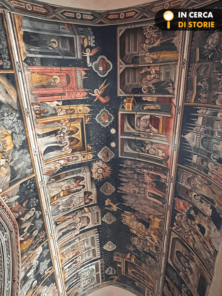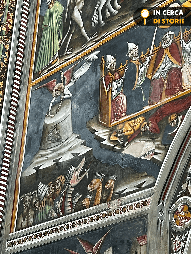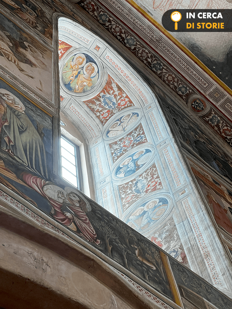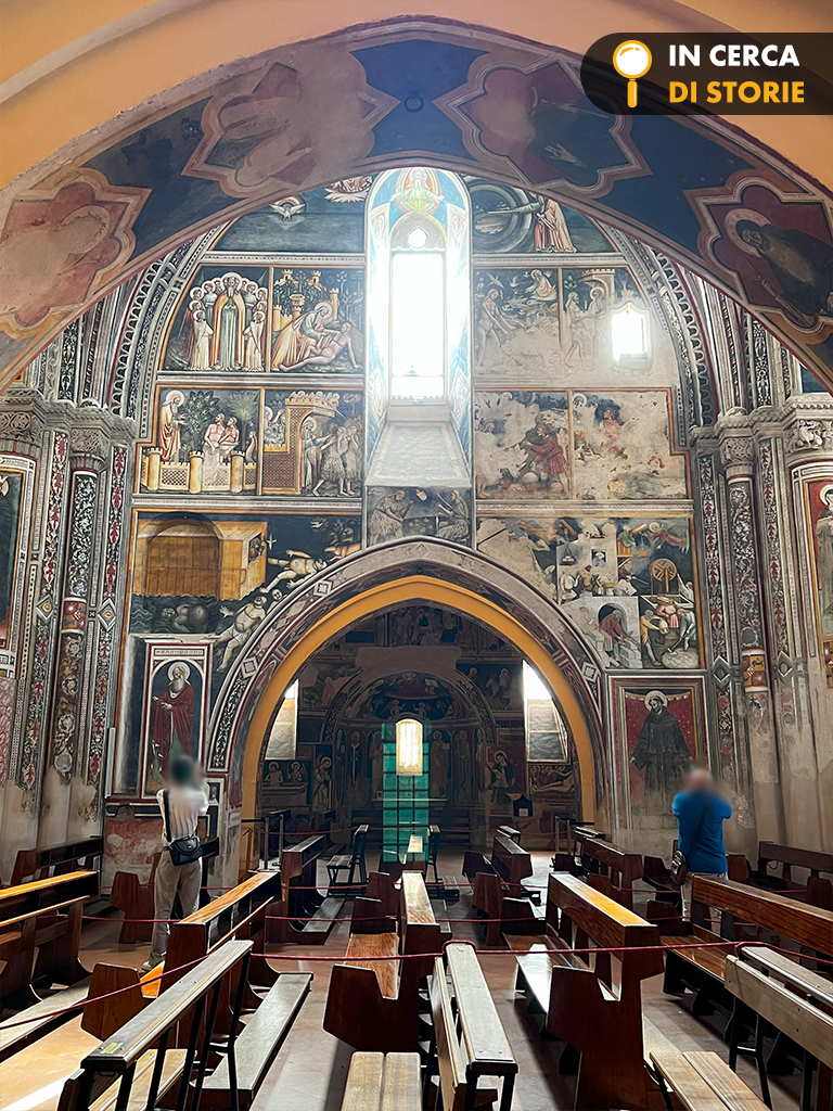 La basilica è una commistione di stili, principalmente Romanico e Gotico. Il punto forte, senza dubbio, sono i suoi interni affrescati in stile giottesco e della scuola senese voluti dalla principessa Maria d’Enghien che non era soddisfatta dei primi affreschi della basilica commissionati da suo marito. Come potete vedere bene in foto, il colpo d’occhio è notevole. I dettagli sono infiniti e l’atmosfera che creano è unica.