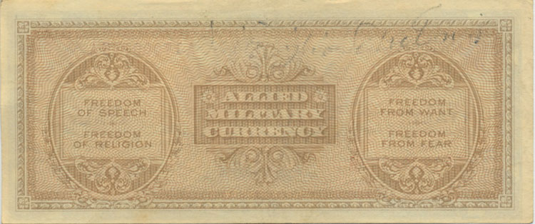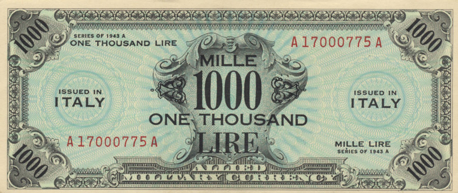 Gli Alleati pianificano di aprire un nuovo fronte in Europa per impegnare la Germania nazista e alleggerire la pressione sul fronte orientale. Il piano segreto per lo sbarco in Italia prevede l’emissione di una banconota ad hoc da distribuire sui territori occupati. Nel marzo del 1943 la bozza delle banconote che appariranno in Italia è già pronta e stampata ma non presenta la dicitura del paese dove sarà distribuita, questo per evitare che il piano segreto di invasione possa essere scoperto.