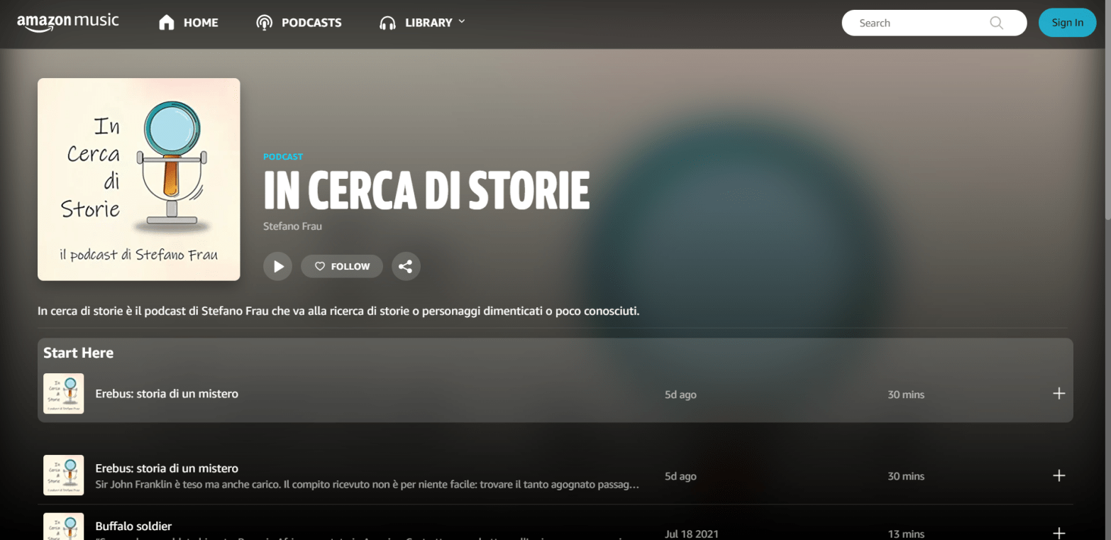 Da oggi puoi ascoltare In cerca di storie anche su Amazon Music nella sezione podcast. Trovi tutti gli episodi fin qui pubblicati. Clicca qui per accedere alla pagina di In cerca di storie.
